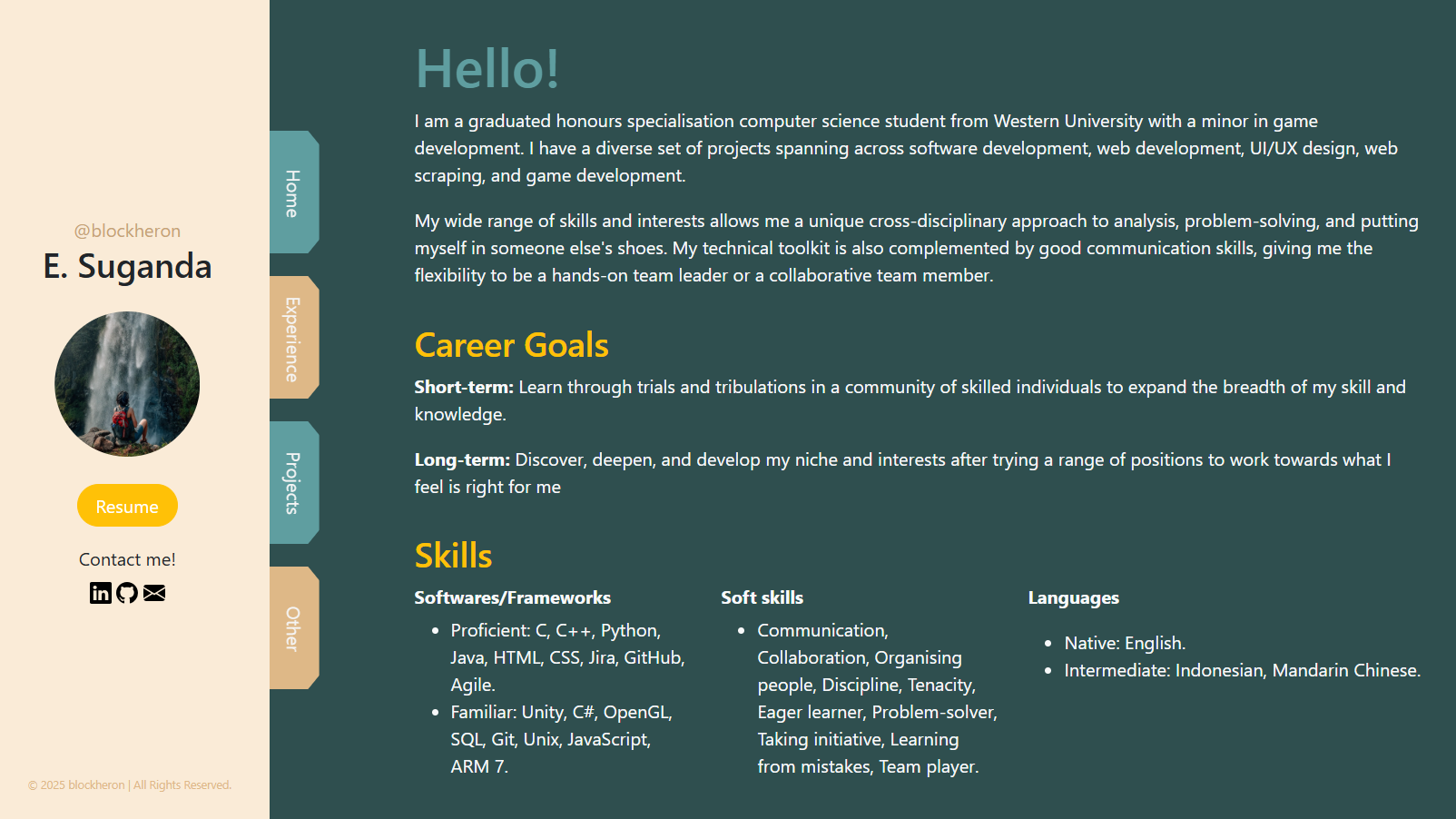 I am a graduated honours specialisation computer science student from Western University with a minor in game development. I have a diverse set of projects spanning across software development, web development, UI/UX design, web scraping, and game development.
